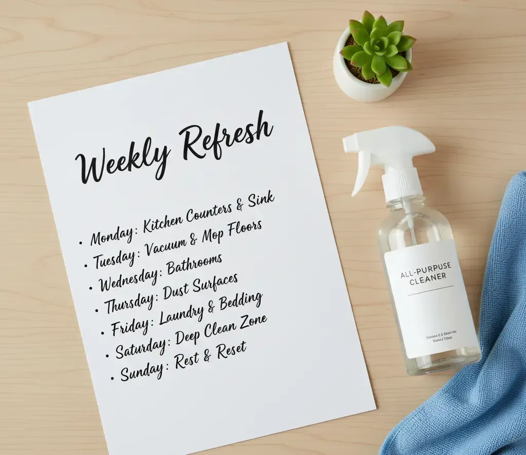 Apps like Tody track chores with fun reminders. Stock multi-surface sprays and labeled bins for quick storage. A good robot vac handles floors while you relax.